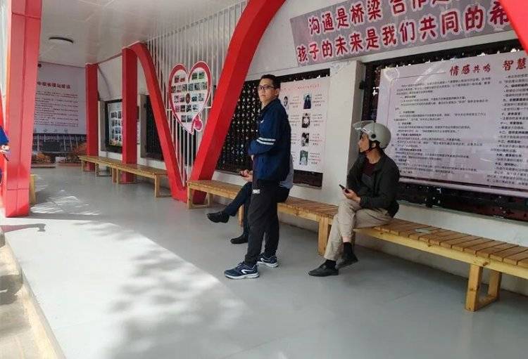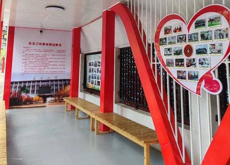 家长驿站位于东方二中校门两侧,面积约400平方米。它利用校园内临街的闲置空地,增添了风雨长廊和长条座椅,设置了家长休息区、家长阅读区、心理健康教育宣传区、家庭教育交流区等功能区域。它不仅兼顾了实用性、美观性,还融入了校园文化元素,成为校门口一道独特的风景线。家长们在这里等待时,少了一份枯燥,多了一份温馨。
