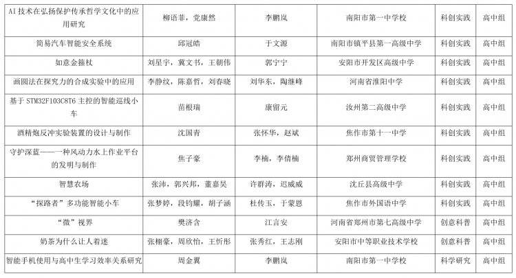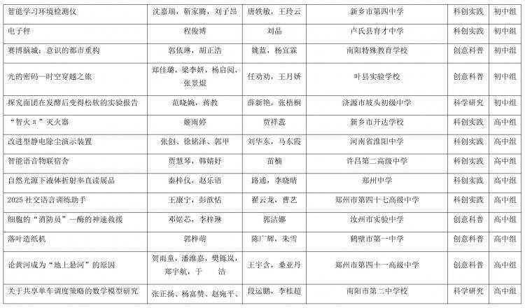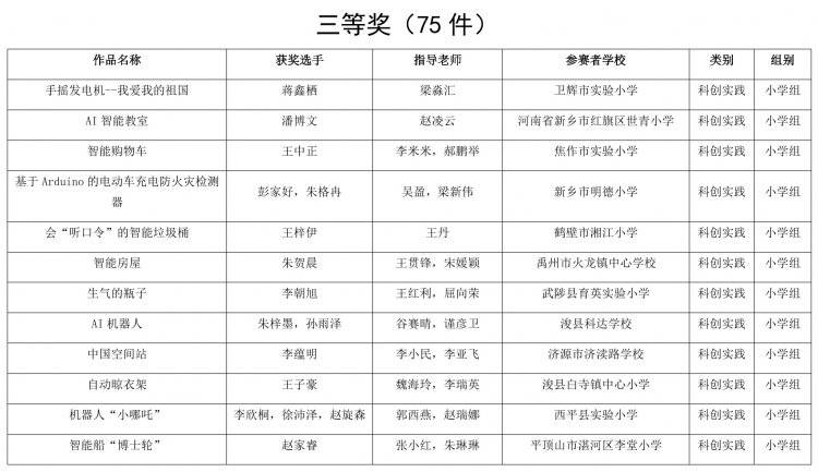 根据《河南省科学技术协会 河南省教育厅关于举办第二届河南省青少年科技运动会暨首届中小学生科学创新优秀作品展示活动的通知》(豫科协发〔2025〕37号)精神,首届中小学生科学创新优秀作品展示活动经分赛区选拔、省级初审、现场评审等环节,共评出一等奖52件、二等奖68件、三等奖75件。现将获奖名单(详见附件)予以公示。