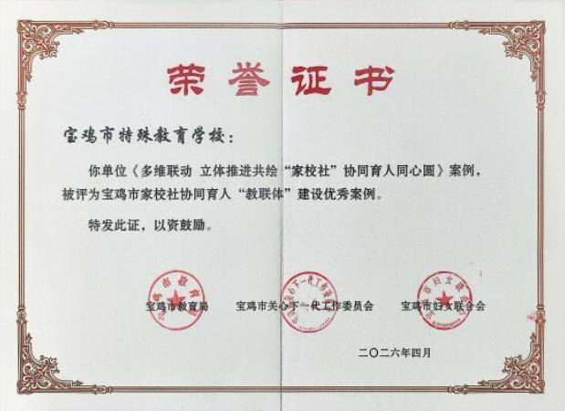 近日,宝鸡市特教学校《多维联动 立体推进 共绘“家校社” 协同育人同心圆》案例凭借扎实的实践探索与鲜明的办学特色,成功获评宝鸡市家校社协同育人“教联体” 建设优秀案例,并入选《融智·共育·未来》宝鸡市家校社协同育人“教联体”典型案例集,为学校家校社协同育人工作再添殊荣,充分彰显了特教校在家校社协同育人领域的扎实成效与示范引领作用。